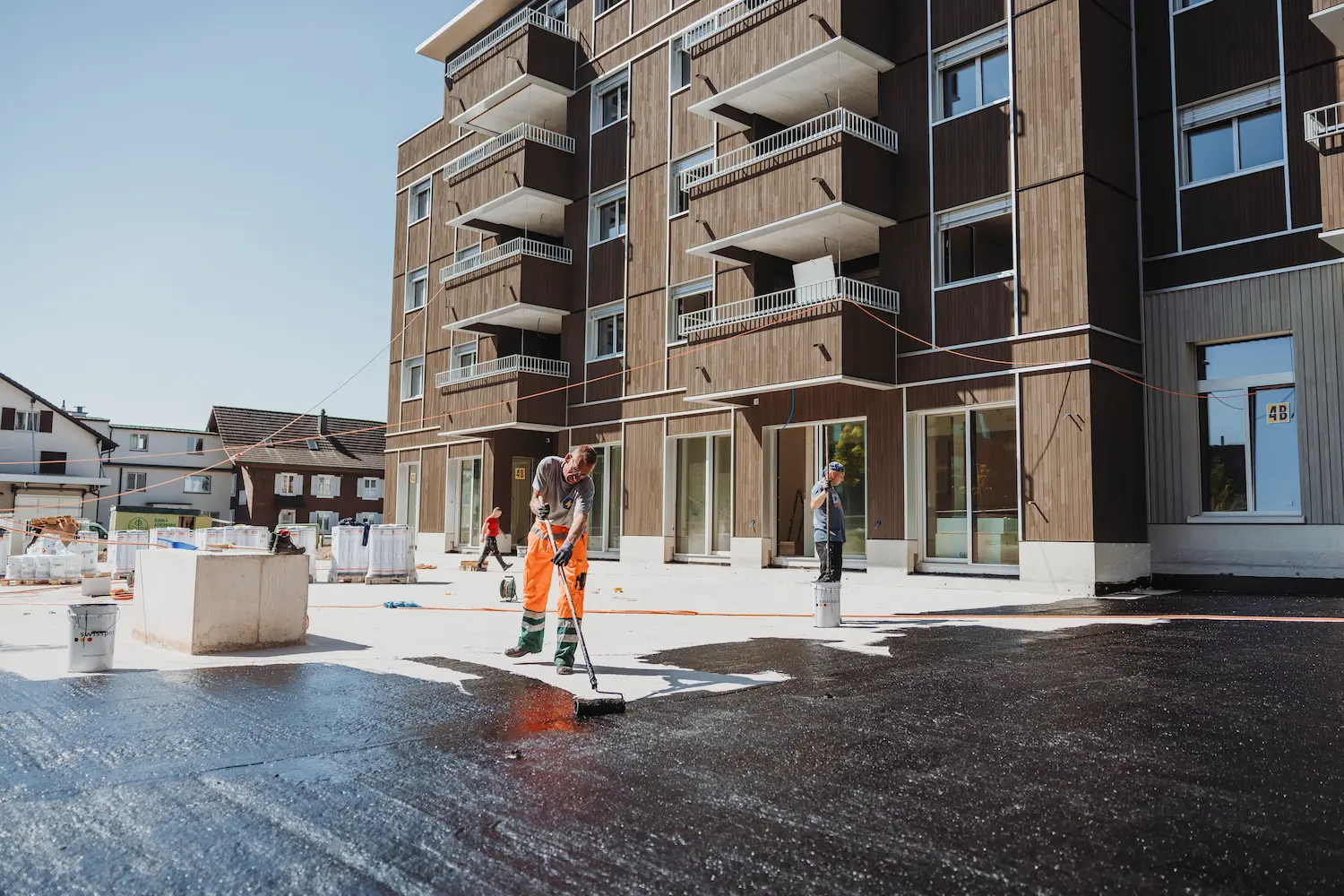 Ergänzend wurde der innere Perimeteraufbau erstellt und die Anschlüsse der Fenster mit Flüssigkunststoff (FLK) abgedichtet. Durch die präzise Ausführung dieser Arbeiten wurde ein dauerhafter Wärme- und Feuchtigkeitsschutz sichergestellt: eine wichtige Grundlage für die Energieeffizienz und Langlebigkeit des Neubaus.