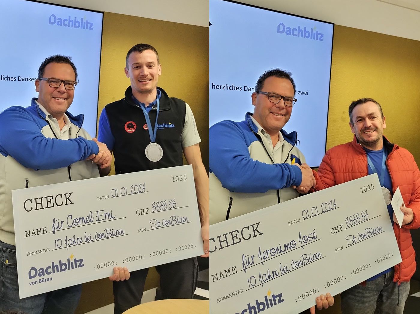 Seit 2014 zählen wir Jeronimo José Pereira und Cornel Erni zum Dachblitz-Team. 10 Jahre sind Grund genug, um zu feiern! Als Dankeschön gab es für beide die bewährten Dachblitz-Checks mit einer Anerkennung für die angenehme und erfolgreiche Zusammenarbeit.